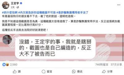 不只如此,葛斯齊更分析王定宇所提供的截圖,根本就是從他臉書上截取的頭像:「那個東西,那個叫P圖。」更強硬表示不排除提告,「他還把圖下架,重新再貼上去,他貼上去的時候把我的頭像跟文字都截掉了,那個『沒錯』不見了,我的頭像也不見了,那為什麼我的頭像不見了?因為已經被網友抓出來上面有P圖的痕跡,其實很明顯的。」最後更是嘲諷王定宇:「你把人民當成笨蛋,實打實的東西才經得起考驗,連最基本的這個東西都經不起考驗,你要打什麼官司啊?」