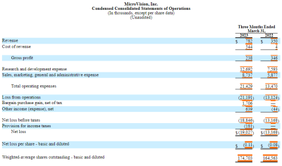 AEye綜合經營及全面虧損報表(以千美元計,股份和每股數據除外) 在經營成本方面,AEye今年第一季度支出了944.2萬美元用於研究與开發。綜合其他銷售成本、行政支出等費用,公司淨虧損2626.5萬美元,較2022年同期的淨虧損2488.1萬美元,虧損增幅不大。 另外,股票方面,公司第一季度每股淨虧損爲0.16美元。 MicroVision MicroVision是一家基於MEMS的激光束掃描技術廠商,2022年底公司宣布已籤署協議以1500萬歐元收購德國Ibeo的部分資產。收購完成後,進一步擴大其激光雷達產品在工業、智能基礎設施、機器人和商用車領域的應用。 公司未經審計的2023年第一季度財報顯示,MicroVision營收78.2萬美元,較2022年同期的35萬美元翻了一倍。而公司在研發方面支出了1269.2萬美元,各項運營費用總支出達2119.1萬美元。