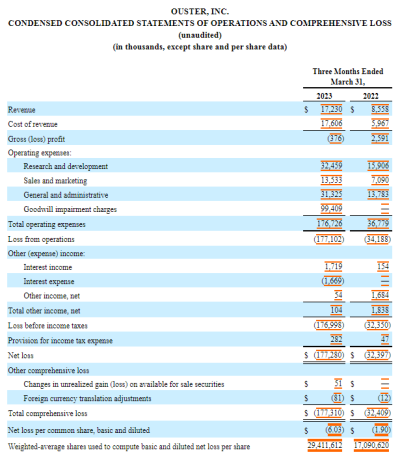 出貨量方面,第一季度激光雷達交付量爲34834台,同比增長402.9%。據悉,禾賽科技第一季度毛利率爲37.8%,環比增長7.8%。禾賽表示,2023年將是公司“轉型之年”,公司全球化業務板塊將加速拓展。目前,公司設立在歐洲“汽車之都”斯圖加特的辦公室已正式开業。 Ouster Ouster未經審計的2023年第一季度財報顯示,公司營收1723萬美元,對比2022年同期的855.8萬美元,增長了101.33%,實現收入翻倍。這其中,Veolodyne在今年2月與Ouster正式完成合並,想必在其中也貢獻了一部分收益。 在經費費用方面,公司的研究與开發支出3245.9萬美元,對比2022年同期也增加了一倍多。加上銷售、行政等成本支出和其他虧損,公司淨虧損達1.77億美元,2022年同期爲3239.7萬美元。