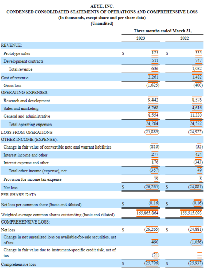 Luminar及其子公司合並經營報表(以千美元計,股份和每股數據除外) 但綜合總運營費用金額巨大,近1.3億美元。Luminar總體還是虧損較大,淨虧損爲1.47億美元。平均到每股淨虧損0.4美元。 AEye AEye總部位於加利福尼亞州都柏林,是面向車輛自動駕駛、高級駕駛輔助系統(ADAS)和機器人視覺應用的下一代智能自適應LiDAR提供商。 5月11日,AEye申請的未經審計的2023年第一季度財報顯示,公司產品銷售營收僅12.5萬美元,新增合同營收51.1萬美元,總營收爲63.6萬美元,較2022年同期下降了41.2%。