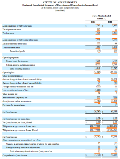Ouster綜合經營及全面虧損報表(以千美元計,股份和每股數據除外) 另外,財報指出,Ouster第一季度平均每股淨虧損6.03美元,是目前全球激光雷達上市企業中虧損額最大的。 Cepton 美國激光雷達解決方案供應商Cepton公开了公司及其子公司未經審計的簡明綜合經營及綜合收益表。 其財報顯示,Cepton在2023財年第一財季收入148.50萬美元,其中激光雷達傳感器和樣機收入124萬美元,开發收入24.5萬美元。公司去年同期收入也是148.50萬美元,同比並無增長。