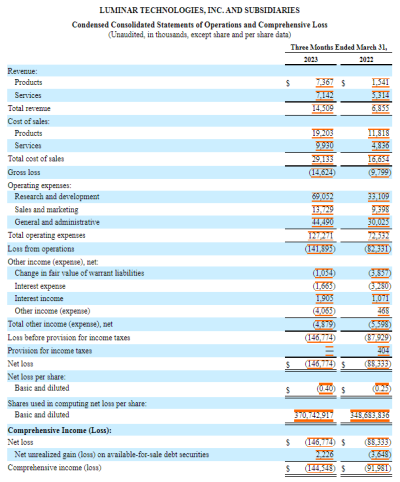 Aeva綜合收益及虧損報表(以千美元計,股份和每股數據除外) 綜合各項收支數據,Aeva在今年前三個月淨虧損爲3517.4萬美元,對比2022年同期淨虧損增加200萬元。股票方面,基本每股淨虧損爲0.16美元。 Luminar Luminar是一家自主車輛傳感器和軟件公司,其愿景是通過提供唯一滿足行業嚴格性能、安全性和經濟性要求的激光雷達和感知平台,使自動駕駛安全且無處不在。 在Luminar及其子公司未經審計的2023年第一季度綜合財報中,Luminar通過產品銷售獲得了736.7萬美元收入,靠提供相關服務營收714.2萬美元,總營收爲1450.9萬美元,同比2022年同期增長了111.66%。