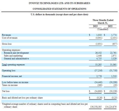 另外,從財報數據來看,Cepton第一財季仍處於虧損狀態。淨虧損達1474.2萬美元。對比2022年第一財季淨收入4119.8萬元,今年營收效益下降很多,基本每股淨虧損0.09美元。 Innoviz Innoviz是一家以色列固態激光雷達傳感器研發商,專注於研發固態激光雷達傳感器。公司成立於 2016 年,在 2018 年被寶馬選爲激光雷達供應商,2021 年 4 月通過 SPAC 方式在美國納斯達克上市。 據其2023年第一季度財報數據,Innoviz今年一季度營收101萬美元,經營損失達3721.6萬美元。其中研究與开發成本投入2610.2萬美元。