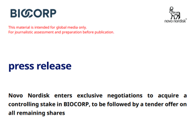 6月5日,諾和諾德與Biocorp的主要股東Bio Jag達成收購協議,以35歐元/股的價格收購後者在Biocorp持有的全部股份(包括45.3%的股本和62.23%的理論投票權),總交易額爲1.54億歐元(約1.66億美元,按今年平均匯率換算,1歐元=1.0797美元)。