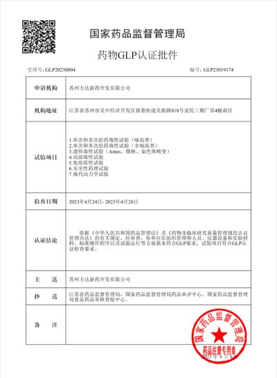 2023年6月6日,方達控股蘇州安評中心獲得國家藥品監督管理局(National Medical Products Administration, NMPA)頒發的GLP認證證書(Good Laboratory Practice,GLP)。NMPA GLP證書的獲得表明方達控股蘇州安評中心在組織架構與人員培訓、儀器設備與計算機化系統、實驗材料、標准操作規程以及試驗運行等方面均已滿足中國GLP法規要求。