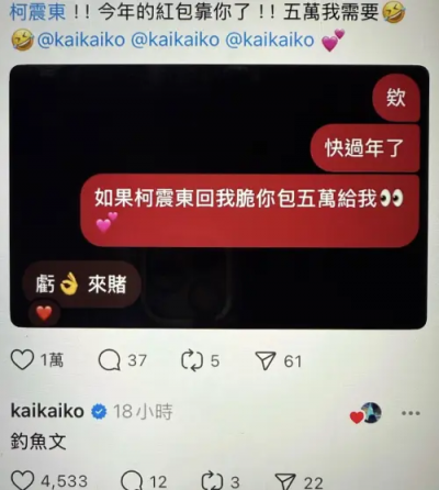 標題:脆友過年紅包就靠柯震東!「他回脆就給紅包」遊戲 釣出本尊回應