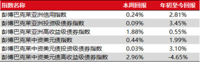 上周,亞洲市場新發債券總額環比下降,合計約50億美金;年初至今合計發行874億美金,同比-34.5%。二級市場表現:彭博巴克萊亞洲信用指數全周回報爲0.24%,彭博巴克萊亞洲投資級債券指數回報爲0.09%,彭博巴克萊亞洲高收益級債券指數回報爲1.88%。彭博巴克萊中資美元債指數全周回報爲0.44%,彭博巴克萊中資美元債投資級債券指數回報爲0.03%,彭博巴克萊中資美元債高收益級債券指數回報爲2.96%。