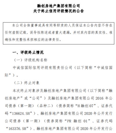 顯示,2023年6月6日,融創房地產集團向中誠信國際信用評級有限責任公司(以下簡稱“中誠信國際”)發送《融創房地產集團有限公司關於“H融創07”、“PR融創01”、“20融創02”、“H1融創01”和“H1融創03”評級機構終止合作的函》。因融創房地產集團目前無法提供評級所需資料,且根據自身需求並結合相關業務實際情況,不再委托中誠信國際對公司主體及相關債項進行信用評級。